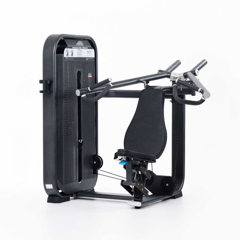 Тренажер Жим от плеч предназначен для изолирующих упражнений на дельтовидные мышцы, развивает силу и стабилизирует плечевые суставы. Дополнительную нагрузку в упражнении получают трицепсы, трапециевидные мышцы и большие грудные мышцы. Две пары многопозиционных рукояток и заданная траектория движения обеспечивает безопасное при выполнении упражнения положение для плечевых и локтевых суставов.