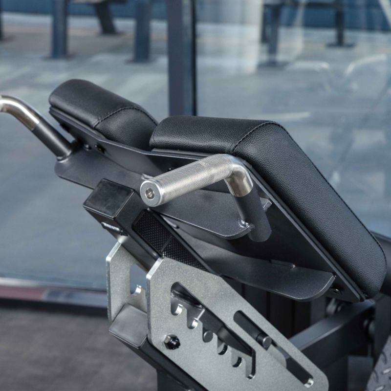 - Рабочая зона тренажёра оснащена двумя отдельными подушками для опоры бёдер длиной 340 мм и шириной 190 мм каждая. Расстояние между подушками 85 мм. Подушки имеют скруглённые края для комфорта и равномерного распределения давления. Высота подушек регулируется вручную в шести положениях при помощи механического фиксатора. Начальная высота между верхним краем подушки и наклонной платформой для ног составляет 920 мм, максимальная – 1110 мм.