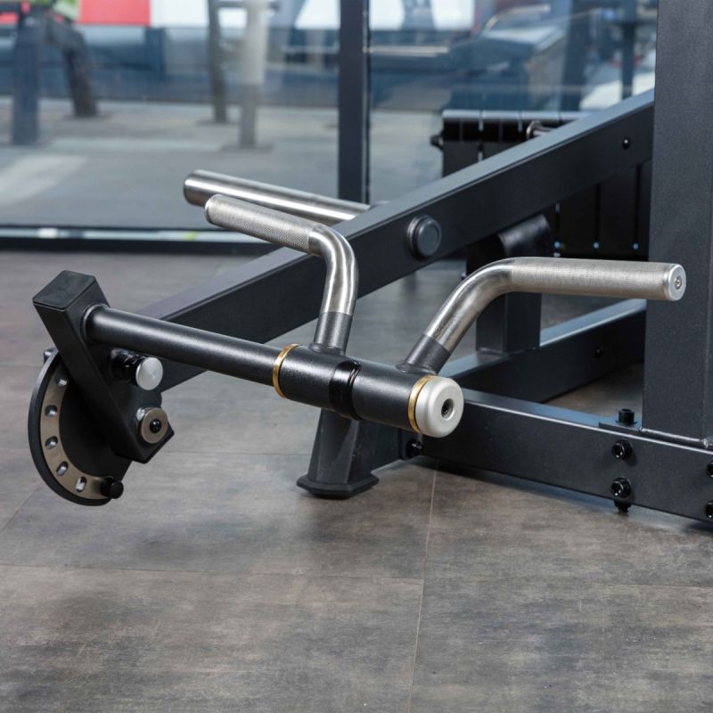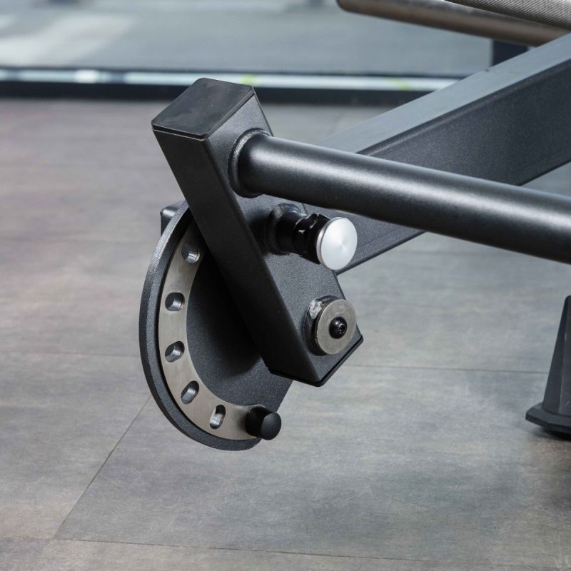 - Рычаг снабжён двумя рукоятями V-образной формы, положение которых регулируется по дугообразной направляющей в шести фиксированных положениях. Дополнительно рукояти имеют ограниченное свободное движение по полукруглой траектории, что обеспечивает естественную биомеханику при выполнении упражнения.