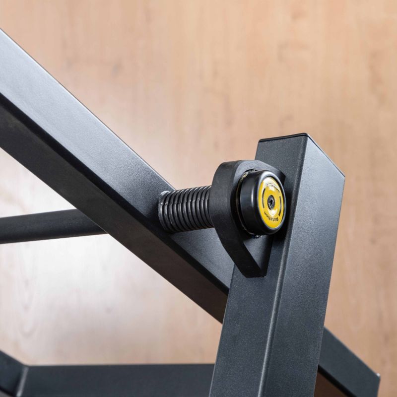 - Подвижный рычаг снабжён встроенным противовесом, компенсирующим начальную массу конструкции и обеспечивающим лёгкий старт без дополнительных дисков – это повышает комфорт и снижает нагрузку на плечевые суставы в начале упражнения.