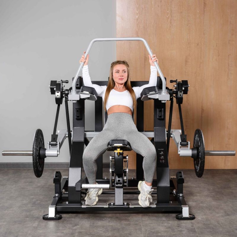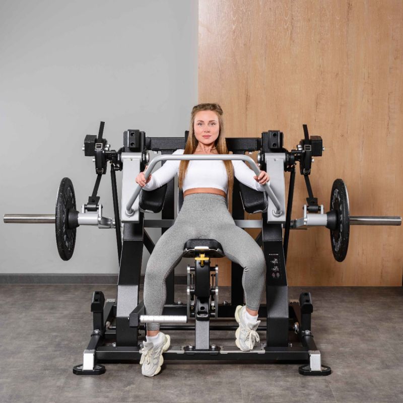 - Система перемещения нагрузки обеспечивает равномерное распределение усилия на протяжении всей траектории движения рычагов, поддерживая устойчивое напряжение мышц в каждой фазе упражнения.