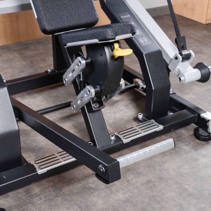 - Сиденье регулируется по высоте при помощи сдвоенной системы газовых упоров и лапки, расположенной непосредственно под сиденьем, позволяя максимально точно настроить тренажёр под индивидуальные антропометрические данные пользователя.