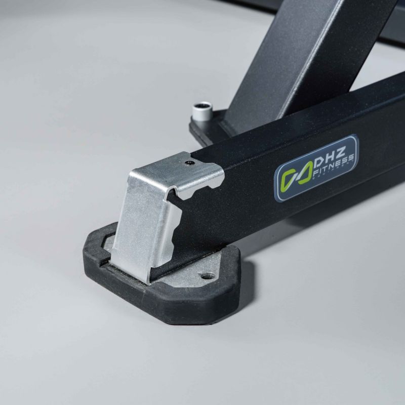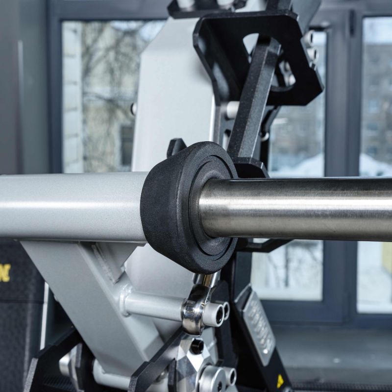 - Накопители на подвижных рычагах и статичные для хранения оборудованы кольцами из плотной резины для предотвращения соприкосновения дисков с рамой тренажера и амортизации при размещении свободных весов на накопителях.