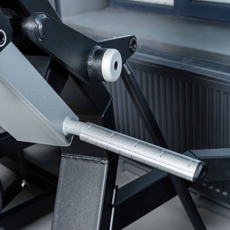 - Тренажер оснащён системой быстрого старта при помощи ножного рычага, выполненного из прямоугольного профиля, и педали длиной 230 мм, выполненной из металлического прутка с дополнительной декоративной защитой из алюминия.